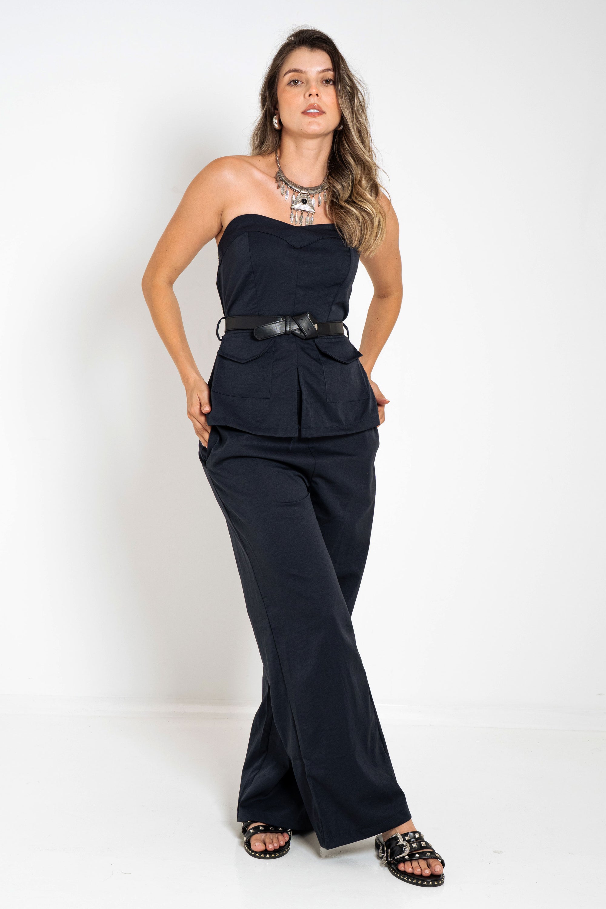 BLUSA STRAPLE BOLSILLOS AZUL OSCURO
